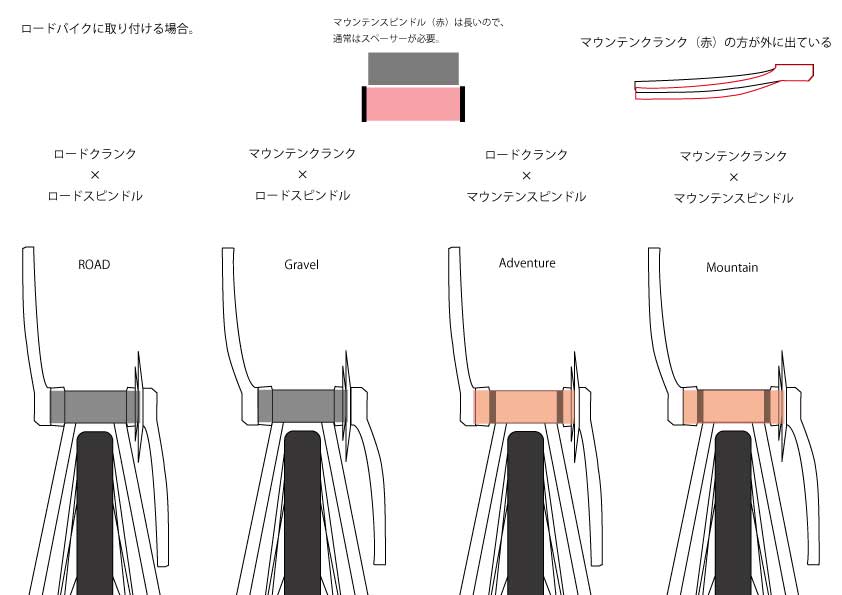 グラベルバイクで使用するにはMクランクとRスピンドルの組み合わせ。